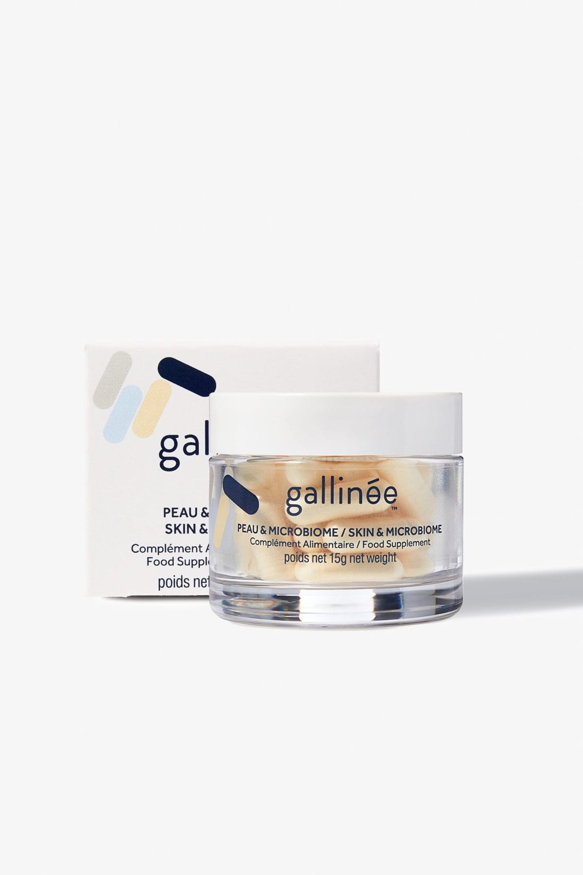 Gallinée est une marque française qui propose des produits de beauté et des compléments alimentaires. La capsule pour les peaux sensibles est un complément alimentaire à base de ferments lactiques, levure enrichie en sélénium* et vitamine B2*. Il est suppos aider le microbiome intestinal, l’apaiser. La fabrication est française.